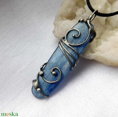 A medál Tiffany technikával készült kianit (disztén) és ólommentes, ezüsttartalmú ón felhasználásával. A díszítés szintén saját készítésű, nem tartalmaz gyári elemeket. A fémrészt óezüstre patináztam és lelakkoztam, hogy sokáig szép maradjon.