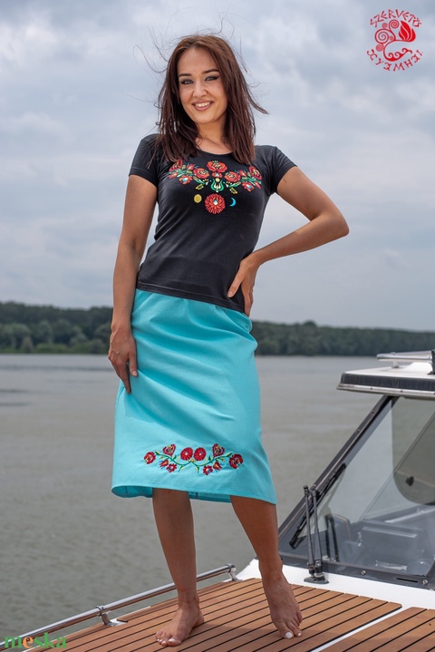 Szervető-matyó motívum-feldolgozással díszített, "V" nyakú, indás mintával, karcsúsított fazonú, rövid ujjú női póló, színes selyemcérnával hímezve.