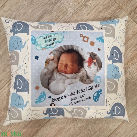 Kisfiús saját fotóval Egyedi emlékpárna születési adatokkal