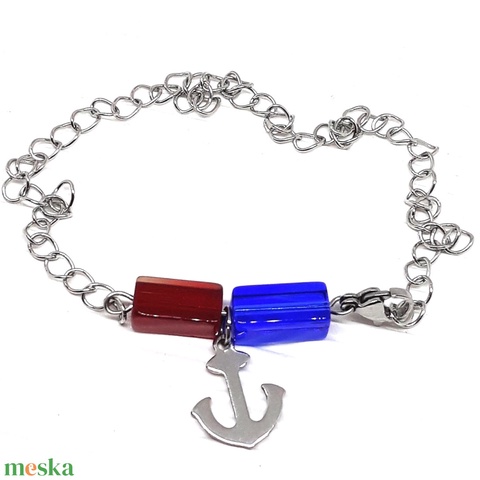 NEMESACÉL bokalánc tengerész stílusban, minimal üveggyöngyökkel, horgony charmmal, nemesacél ékszer