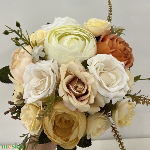 Barack-fehér bazsarózsás és rózsás menyasszonyi örökcsokor