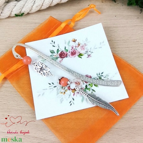 Toll könyvjelző narancssárga és fehér gyöngyökkel, valamint tibeti ezüst kiegészítőkkel díszítve.