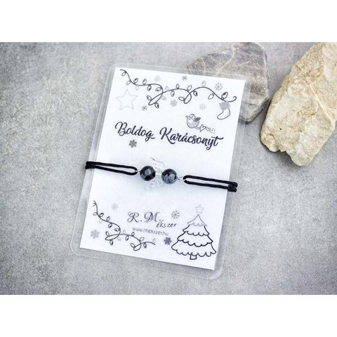 A számotokra állítottunk össze egy kedves ajándékot, szeretettel! A karkötőt a kártyával együtt kapjátok meg!​A köszönő csomag tartalma: 1 db karkötő 1 db köszönő kártya Ez a karkötő remek meglepetés lehet bárkinek, akit szeretnél megajándékozni. A laminált kívánság kártya mérete 110×80 mm.Az angyalok szerint, ha mindenki megtanulna kérdések, kételyek nélkül bízni az ösztöneiben, a világ sokkal békésebb hely lehetne. Bízz magadban, és válaszd ki saját védőangyal vagy segítő angyalodat! A megérzés útba igazító, és nem megmagyarázó rendszer. Tanulj meg tehát bízni az ösztöneidben anélkül, hogy mindig keresnéd a magyarázatokat, a visszaigazolást.Ez a karkötőnk tökéletesen antiallergén, így fémre érzékenyeknek is bátran ajánljuk.A medál mérete: 28×20 mm. A valódi ásvány angyal medál fém akasztó részét acélból / orvosi fémből készítettük. Az angyalka szárnya akrillból készült. Az angyalka fejét, és testét valódi 8 mm-es hópehely-obszidián ásvány gyöngyök alkotják.A karkötő microcord zsinóros kivitelének köszönhetően minden méretű csuklón kényelmes viselet. Speciális csúszócsomók segítségével van elkötve a zsinór, így méretre tudod igazítani. Fontos, hogy óvatosan húzd a zsineget a csomókon keresztül.A karkötő 14, és 20 cm-es csuklóméret között állítható. A microcord zsinór nagyon tartós, és könnyű nylon anyag, átmérője 1,7 mm.Amit az obszidiánról érdemes tudnod: Sötét téli este, még a Hold sem világít. Kinézünk meleg lakásunk ablakából és látjuk az utcai lámpa fényénél, hogy nagy, kristályos szemekben szállingózik a hó. Ilyen hatású a hópehely obszidián megjelenése is. Az obszidián vulkanikus kőzet, amely a hirtelen kihűlt és megkövesedett lávából keletkezik, a benne lévő "hópelyhecskék" pedig belső kristályok. Lelki gyógyhatása: Ahogy ez a kő mintázata lenyűgözően hat ránk, úgy érik meg bennünk az igény életünk szükségtelen mintázatainak feloldása iránt. Érzékenyebbé tesz a körülöttünk történő események iránt, segít a tisztánlátásban. Aktiválja tudatfelettinket, és segít felismerni és integrálni elfojtott énünket, ezért javasolt használata meditáció alatt. Megszünteti az energiaáramlási blokádokat. Testi gyógyhatás: Hatásosak allergia esetén, fokozza a vérellátást, segíti az emésztést. Általános életerővel tölt el minket használata során. Gyulladáscsökkentő hatású, jó izomfájdalmak kezelésére is. Hozzárendelt mágikus hatás:  Negatív energiák ellen védelmező kő. Csillagjegyei: Mérleg Skorpió, Bak Csakrái: Gyökércsakra  Figyelem! Az ásványokat, kristályokat az őskor óta használják a test, a lélek és az érzelmek harmonizálására. Az ókori kultúrákban kifejezetten elterjedtek voltak. Az évezredek alatt számtalan tudás és tapasztalat gyűlt össze róluk. Ásvány ékszereink leírásánál a meghatározó szakirodalom alapján készült összegzések olvashatók. Fontos! Az ásvány ékszerek viselése, az ásványok és kristályok gyógyításban, alternatív terápiaként való használata nem helyettesíti a modern orvostudományt, a gyógyszeres kezelést. Betegség esetén az öngyógyítás helyett kérjük, forduljon szakemberhez!