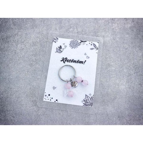 Számotokra állítottunk össze egy kedves meglepetést!"Köszönöm"feliratos ajándékkártya rózsakvarc kulcstartóvalA kulcstartót a kártyával együtt kapjátok meg!A köszönő csomag tartalma: 1 db rózsakvarc díszes kulcstartó 1 db köszönő kártyaVan, amikor nehéz szavakat találni, vagy egészen egyszerűen hangok nélkül szeretnénk kifejezni a gondolatainkat, érzéseinket. Ebben segítenek kívánság vagy köszönő kártyáink, melyek a kiválasztott kulcstartóval együtt csodálatos ajándékok lehetnek. A laminált kívánság kártya mérete 110×80 mm.Amit a rózsakvarcról érdemes tudnod:A festetlen rózsakvarc az egész világos, szinte áttetszőtől, a ködös középrózsaszínig terjed. Az egyik legnépszerűbb kövek egyike, amely szépséges küllemének és erős gyógyhatásának köszönhető. Története a görög és római mitológiába nyúlik vissza, amely szerint a rózsakvarc Erósznak és Ámornak a szerelem Isteneinek az emberek felé nyújtott ajándéka.Lelki gyógyhatás:Már tehát az ókoriak is hittek a kő szerelem terén gyakorolt pozitív hatásaiban. A rózsakvarc a szívcsakrán keresztül segít az érzelmi blokádok feloldásában, megnyitja belső kapukat, hogy a csodát, szeretetet és szerelem formájában magunkévá tehessük. Érzelmi blokkok feloldása a szerelem lelki és testi kiteljesedését segíti. Az érzelmi gátak felszabadítása a termékenységet is magában hordozza, így ez a kő terméketlenség esetén is hasznos lehet. A rózsakvarc egyéb területeken is bizonyíthatja pozitív hatásait. Mivel segít megtalálni az életben a szépséget és a szeretet lelki egyensúlyunk helyre billentése és alkotó gondolatok megtalálása terén is hasznunkra lehet ez az ásvány. Használjuk meditáció közben haragunk leküzdéséhez és szeretetünk, szerelmünk kiteljesítéséhez.Testi gyógyhatás:Ez a rózsaszín különlegesség testi bajainkra gyógyírt jelenthet, mint a szívcsakra köve, a bőrbetegségek, asztma, allergia és vérszegénység ellen használhatjuk. Védi és erősíti a szívet, harmonizálja a szívritmust.Hozzárendelt mágikus hatás:Sokak szerint a rózsakvarc nem csak a már meglévő szerelmünk intenzívebbé tételében segíthet, hanem az áhított szerelem megtalálásában, magunkhoz vonzásában is.Csillagjegyei: Bika, Rák, MérlegCsakrája: SzívcsakraFigyelem! Az ásványokat, kristályokat az őskor óta használják a test, a lélek és az érzelmek harmonizálására. Az ókori kultúrákban kifejezetten elterjedtek voltak. Az évezredek alatt számtalan tudás és tapasztalat gyűlt össze róluk. Ásvány ékszereink leírásánál a meghatározó szakirodalom alapján készült összegzések olvashatók. Fontos! Az ásvány ékszerek viselése, az ásványok és kristályok gyógyításban, alternatív terápiaként való használata nem helyettesíti a modern orvostudományt, a gyógyszeres kezelést. Betegség esetén az öngyógyítás helyett kérjük, forduljon szakemberhez!