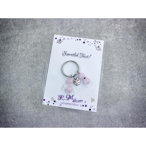 Számotokra állítottunk össze egy kedves meglepetést!"Szeretlek, Tesó!"feliratos ajándékkártya rózsakvarc kulcstartóvalA kulcstartót a kártyával együtt kapjátok meg!A köszönő csomag tartalma: 1 db rózsakvarc díszes kulcstartó 1 db köszönő kártyaVan, amikor nehéz szavakat találni, vagy egészen egyszerűen hangok nélkül szeretnénk kifejezni a gondolatainkat, érzéseinket. Ebben segítenek kívánság vagy köszönő kártyáink, melyek a kiválasztott kulcstartóval együtt csodálatos ajándékok lehetnek. A laminált kívánság kártya mérete 110×80 mm.Amit a rózsakvarcról érdemes tudnod:A festetlen rózsakvarc az egész világos, szinte áttetszőtől, a ködös középrózsaszínig terjed. Az egyik legnépszerűbb kövek egyike, amely szépséges küllemének és erős gyógyhatásának köszönhető. Története a görög és római mitológiába nyúlik vissza, amely szerint a rózsakvarc Erósznak és Ámornak a szerelem Isteneinek az emberek felé nyújtott ajándéka.Lelki gyógyhatás:Már tehát az ókoriak is hittek a kő szerelem terén gyakorolt pozitív hatásaiban. A rózsakvarc a szívcsakrán keresztül segít az érzelmi blokádok feloldásában, megnyitja belső kapukat, hogy a csodát, szeretetet és szerelem formájában magunkévá tehessük. Érzelmi blokkok feloldása a szerelem lelki és testi kiteljesedését segíti. Az érzelmi gátak felszabadítása a termékenységet is magában hordozza, így ez a kő terméketlenség esetén is hasznos lehet. A rózsakvarc egyéb területeken is bizonyíthatja pozitív hatásait. Mivel segít megtalálni az életben a szépséget és a szeretet lelki egyensúlyunk helyre billentése és alkotó gondolatok megtalálása terén is hasznunkra lehet ez az ásvány. Használjuk meditáció közben haragunk leküzdéséhez és szeretetünk, szerelmünk kiteljesítéséhez.Testi gyógyhatás:Ez a rózsaszín különlegesség testi bajainkra gyógyírt jelenthet, mint a szívcsakra köve, a bőrbetegségek, asztma, allergia és vérszegénység ellen használhatjuk. Védi és erősíti a szívet, harmonizálja a szívritmust.Hozzárendelt mágikus hatás:Sokak szerint a rózsakvarc nem csak a már meglévő szerelmünk intenzívebbé tételében segíthet, hanem az áhított szerelem megtalálásában, magunkhoz vonzásában is.Csillagjegyei: Bika, Rák, MérlegCsakrája: SzívcsakraFigyelem! Az ásványokat, kristályokat az őskor óta használják a test, a lélek és az érzelmek harmonizálására. Az ókori kultúrákban kifejezetten elterjedtek voltak. Az évezredek alatt számtalan tudás és tapasztalat gyűlt össze róluk. Ásvány ékszereink leírásánál a meghatározó szakirodalom alapján készült összegzések olvashatók. Fontos! Az ásvány ékszerek viselése, az ásványok és kristályok gyógyításban, alternatív terápiaként való használata nem helyettesíti a modern orvostudományt, a gyógyszeres kezelést. Betegség esetén az öngyógyítás helyett kérjük, forduljon szakemberhez!