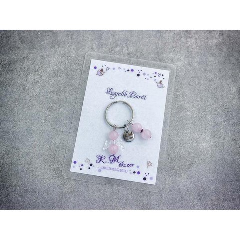 Számotokra állítottunk össze egy kedves meglepetést!"Legjobb barátomnak"feliratos ajándékkártya rózsakvarc kulcstartóvalA kulcstartót a kártyával együtt kapjátok meg!A köszönő csomag tartalma: 1 db rózsakvarc díszes kulcstartó 1 db köszönő kártyaVan, amikor nehéz szavakat találni, vagy egészen egyszerűen hangok nélkül szeretnénk kifejezni a gondolatainkat, érzéseinket. Ebben segítenek kívánság vagy köszönő kártyáink, melyek a kiválasztott kulcstartóval együtt csodálatos ajándékok lehetnek. A laminált kívánság kártya mérete 110×80 mm.Amit a rózsakvarcról érdemes tudnod:A festetlen rózsakvarc az egész világos, szinte áttetszőtől, a ködös középrózsaszínig terjed. Az egyik legnépszerűbb kövek egyike, amely szépséges küllemének és erős gyógyhatásának köszönhető. Története a görög és római mitológiába nyúlik vissza, amely szerint a rózsakvarc Erósznak és Ámornak a szerelem Isteneinek az emberek felé nyújtott ajándéka.Lelki gyógyhatás:Már tehát az ókoriak is hittek a kő szerelem terén gyakorolt pozitív hatásaiban. A rózsakvarc a szívcsakrán keresztül segít az érzelmi blokádok feloldásában, megnyitja belső kapukat, hogy a csodát, szeretetet és szerelem formájában magunkévá tehessük. Érzelmi blokkok feloldása a szerelem lelki és testi kiteljesedését segíti. Az érzelmi gátak felszabadítása a termékenységet is magában hordozza, így ez a kő terméketlenség esetén is hasznos lehet. A rózsakvarc egyéb területeken is bizonyíthatja pozitív hatásait. Mivel segít megtalálni az életben a szépséget és a szeretet lelki egyensúlyunk helyre billentése és alkotó gondolatok megtalálása terén is hasznunkra lehet ez az ásvány. Használjuk meditáció közben haragunk leküzdéséhez és szeretetünk, szerelmünk kiteljesítéséhez.Testi gyógyhatás:Ez a rózsaszín különlegesség testi bajainkra gyógyírt jelenthet, mint a szívcsakra köve, a bőrbetegségek, asztma, allergia és vérszegénység ellen használhatjuk. Védi és erősíti a szívet, harmonizálja a szívritmust.Hozzárendelt mágikus hatás:Sokak szerint a rózsakvarc nem csak a már meglévő szerelmünk intenzívebbé tételében segíthet, hanem az áhított szerelem megtalálásában, magunkhoz vonzásában is.Csillagjegyei: Bika, Rák, MérlegCsakrája: SzívcsakraFigyelem! Az ásványokat, kristályokat az őskor óta használják a test, a lélek és az érzelmek harmonizálására. Az ókori kultúrákban kifejezetten elterjedtek voltak. Az évezredek alatt számtalan tudás és tapasztalat gyűlt össze róluk. Ásvány ékszereink leírásánál a meghatározó szakirodalom alapján készült összegzések olvashatók. Fontos! Az ásvány ékszerek viselése, az ásványok és kristályok gyógyításban, alternatív terápiaként való használata nem helyettesíti a modern orvostudományt, a gyógyszeres kezelést. Betegség esetén az öngyógyítás helyett kérjük, forduljon szakemberhez!