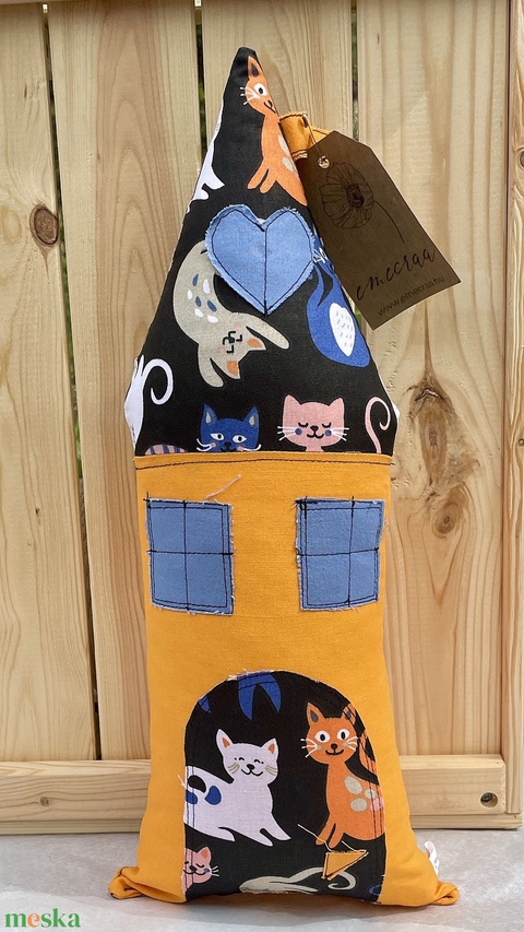 - 100% pamutvászon anyagból készítettem, az anyagot használat előtt beavattam; a töltetet egy belső rétegbe varrtam, így az garantáltan a házikó belsejében marad, és mivel nincs rajta leszedhető rész, biztonságos a kisebb gyerekek számára is.