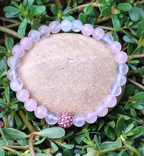Rózsakvarc - tejkvarc ásványkarkötő csillogó gyönggyel, egyedi ásványkarkötő, női ásványkarkötő