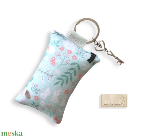 Róka, őz és nyuszi a réten mintás, prémium kulcstartó kis vintage kulcs medállal - Artiroka design