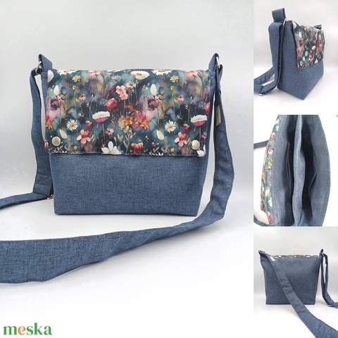 Farmerkék színű válltáska tavaszi virágokkal, vízálló textilből