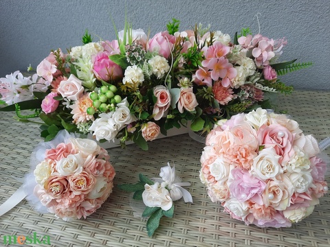 Esküvői örökcsokor szett:Menyasszonyi csokor,dobócsokor, asztaldísz, kitűző
