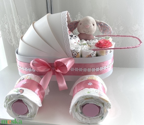 Nyuszi babakocsi pelenkatorta, 2-5 kg pelenkatorony, babaváró csomag