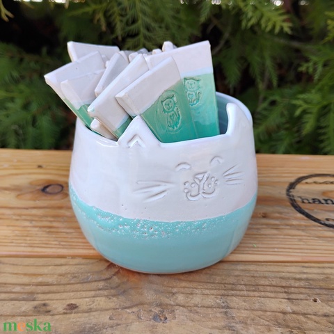 Növényjelölő tartó edényke, cica formájú kis kaspó