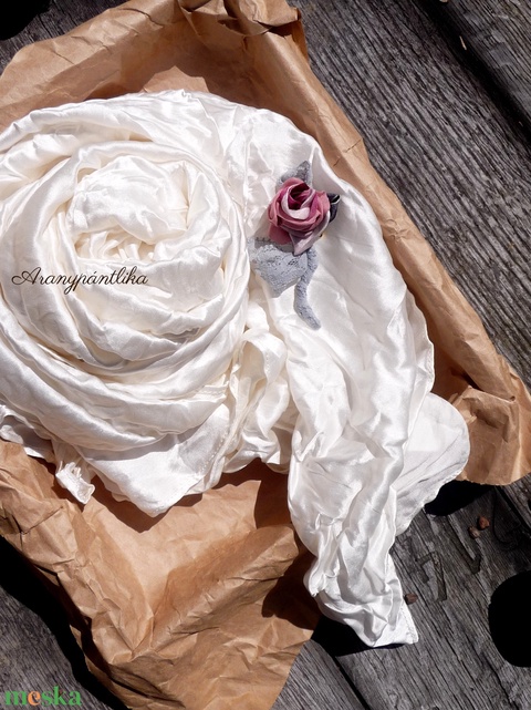 "Törperózsa" szett: tejszín hernyóselyem sál rózsabrossal (Aranypántlika)