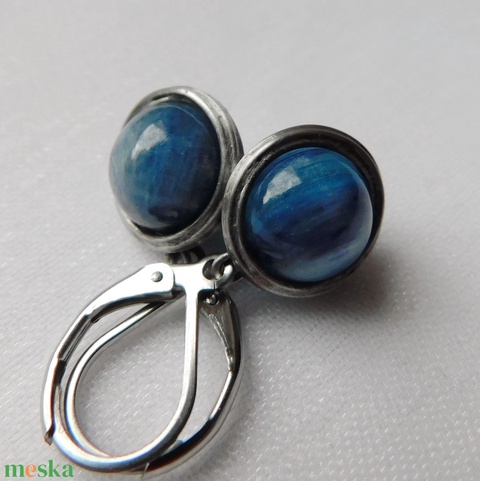 A fülbevaló forrasztással készült kianit gyöngyök és ólommentes, ezüsttartalmú ón felhasználásával. Az egész saját készítésű, nem tartalmaz gyári elemeket.A fémrészt óezüstre patináztam és lelakkoztam, hogy sokáig szép maradjon. Orvosi acélból készült akasztókra tettem