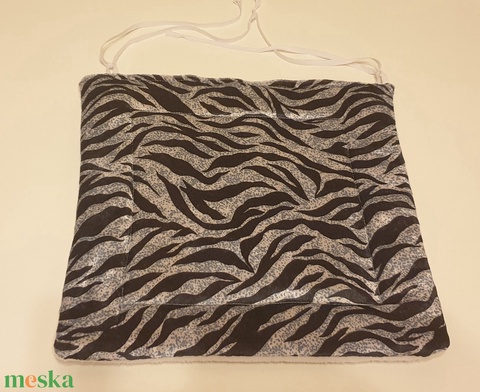 Székpárna, puha és meleg, leoldható kötővel. Bársonyos, ezüst-fekete hullámmintás, fehér thermo anyaggal. Új, egyedi
