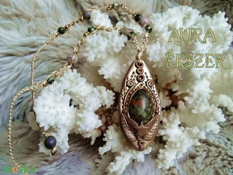 Unakit medál makramén zebrajáspis és riolit gyöngyökkel