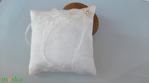 Törtfehér gyűrűpárna , franciacsipkével, strasszal