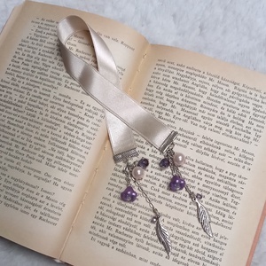 Diszkrét báj - vajszínű szatén könyvjelző lila virágokkal, tollal 9/1