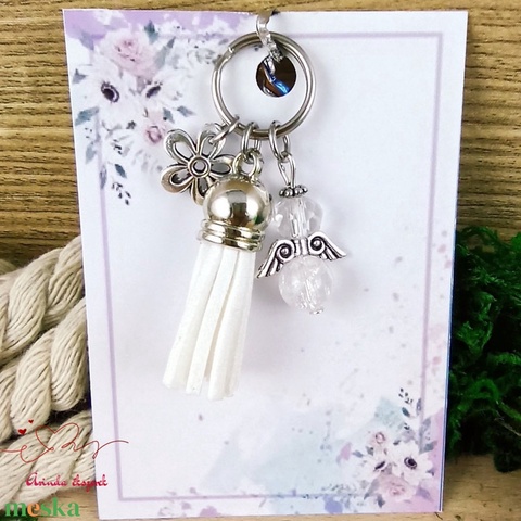 Aurakvarc ásvány angyal fehér bojttal virággal kulcstartó táskadísz pedagógusnapra ballagásra pedagógus