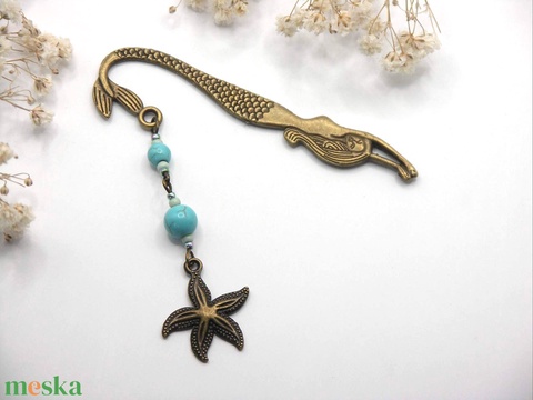 AJÁNDÉK dobozka! Antik bronz, sellő alakú könyvjelző türkinit ásványgyöngyökkel, tengeri csillag függővel – Nyári emlék