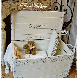 gyerekszoba bútorok, romantikus antikolt festéssel készült fa ajándéktárgyak a provence-i stílus jegyében