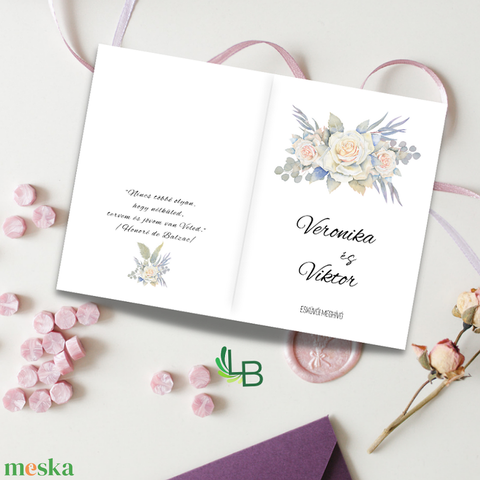 Gyönyörű és elegáns, 4 oldalán nyomtatott kinyitható esküvői meghívó, csodaszép, porcelán virágra emlékeztető grafikával és programleírással.