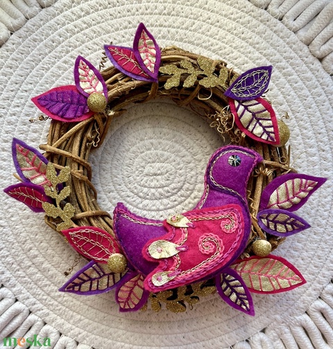 - Anyaga: koszorú alap, festék, fa, filc, hímzőfonal