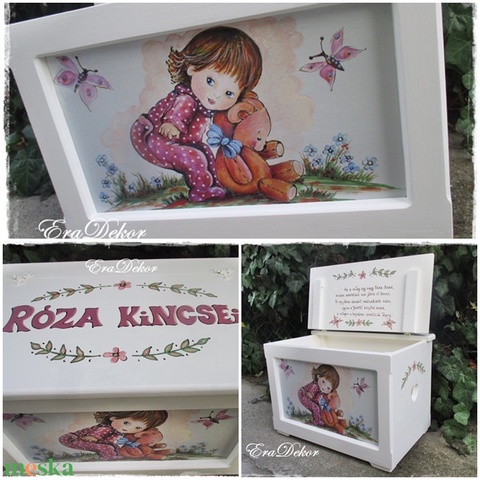 gyerekszoba bútorok, romantikus antikolt festéssel készült fa ajándéktárgyak a provence-i stílus jegyében