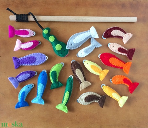 Színpompás mágneses filc horgászjáték, 18 darab halacskával; Készségfejlesztő játékkészlet