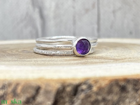 Találd meg a stílusodhoz illő tökéletes harmóniát ezzel a minimalista, kézzel készült ezüst gyűrűszettel. A halmozás (stacking) szerelmeseinek tervezett 3 darabos kollekció a modern elegancia és a természetes ásványok erejét ötvözi. Lila ametiszt, texturált felületek és tiszta ezüst – alkoss belőlük minden nap új kombinációt!