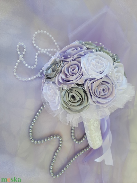- Anyaga: selyemszalag, csipke, gyöngy, bross, gyöngy