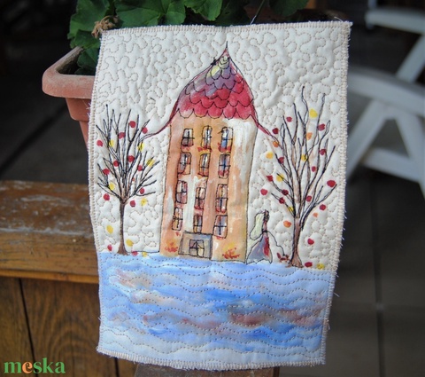 Textilkép- házikós kép, selyem- festett-kép