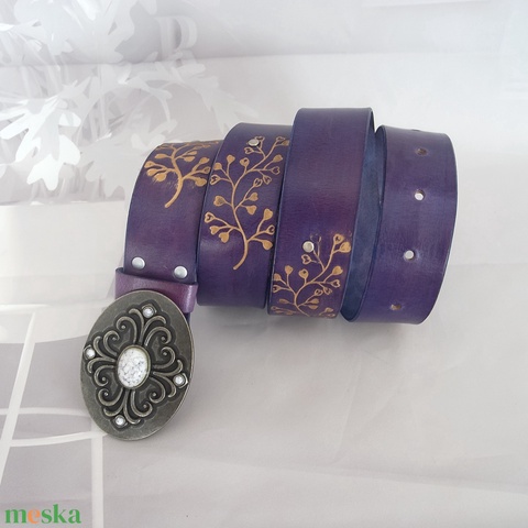 Kézzel festett, padlizsán színű, virágmintás női marhabőr öv, Farmer öv, Western wtílusú női öv