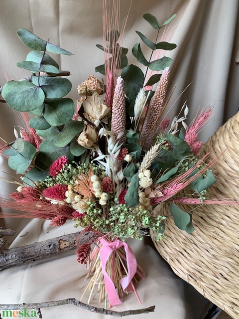 Menyasszonyi csokor natúr,mályva,pasztell színű szárazvirágokkal,eucaliptusszal