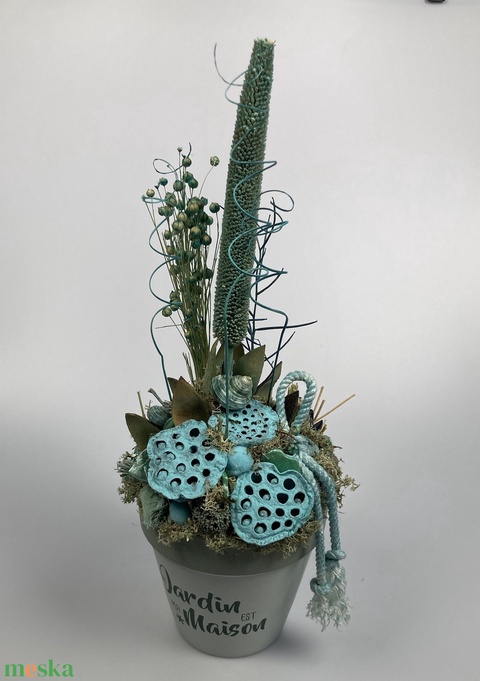 Buzogányos Len(csi) - Vízparti hangulatú tartós, világosszürke-zöld kaspós, türkiz bojtos asztaldísz