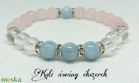 Ásvány neve, mérete: akvamarin 4 db. 8 mm-es, hegyikristály 6 db. 8 mm-es, rózsakvarc 12 db. 8 mm-es