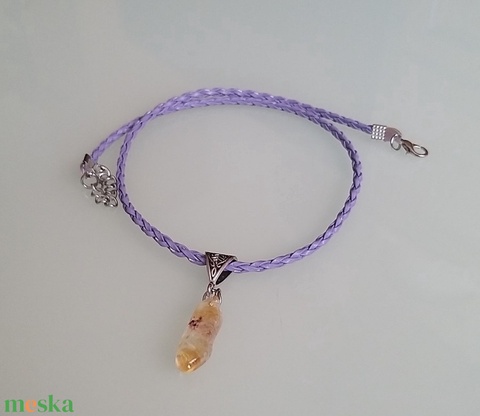 Fonott halványlila műbőrszálon medáltartóval készült.