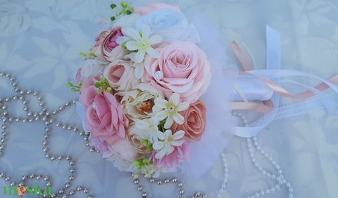 Örökcsokor selyemrózsákból rózsaszín, fehér, ekrü színű menyasszonyi