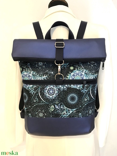 Kék textilbőr/ bőrszerű anyag, vízálló, strapabíró, szennyeződésálló, puha, rugalmas, kellemes tapintású/ és design vízálló mandalás szövet kombinációja, belül kék pamutvászon béléssel.