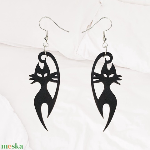 Antiallergén, macska alakú kézzel festett fa fülbevaló, akár Halloweenre is.