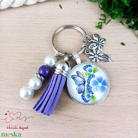 Lila pillangó lila bojtos üveglencsés kulcstartó táskadísz