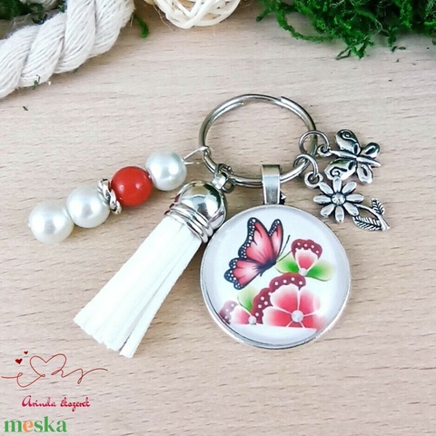Piros pillangó fehér bojtos üveglencsés kulcstartó táskadísz