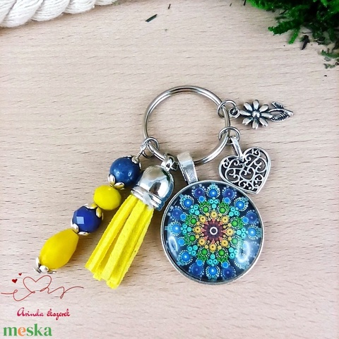 Kék mandala sárga bojtos üveglencsés kulcstartó táskadísz