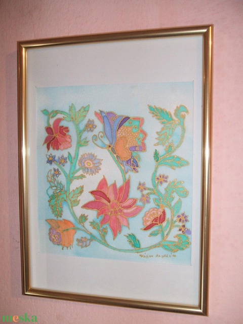 - Anyaga: hernyóselyem, kihuzó, rajzoló, hernyóselyemfesték, ecsetek