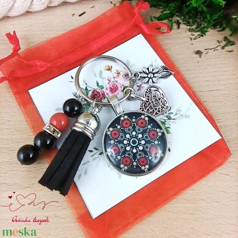 Fekete mandala fekete bojtos üveglencsés kulcstartó táskadísz