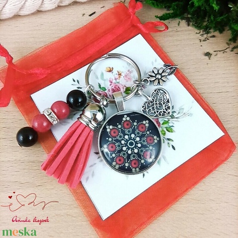 Piros és fekete gyöngyökből, mandala mintával díszített üveglencsés kabosonból, szív és virág medálból, valamint piros velúrbojtból készült kulcstartó vagy táskadísz. A gyöngyöket gazdagon díszítettem tibeti ezüst gyöngykupakokkal és köztesekkel.