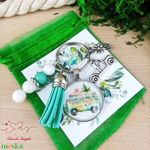 Zöld és fehér gyöngyökből, autó mintával díszített üveglencsés kabosonból, autó és virág medálból, valamint zöld velúrbojtból készült kulcstartó vagy táskadísz. A gyöngyöket gazdagon díszítettem tibeti ezüst gyöngykupakokkal és köztesekkel.