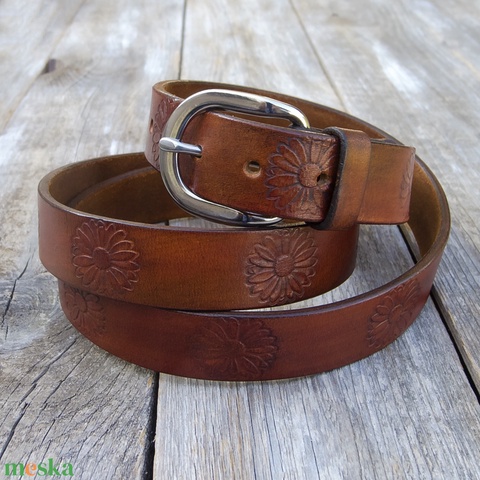 Női Olasz marhabőr öv, Margarétás bőr öv nőknek, Farmeröv dombornyomott margarétával