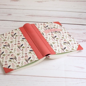Virágmintás, nőies napló rózsaszín bőr gerinccel és sarkokkal. Egyedi felirattal, névvel is kérhető, többféle belső lap